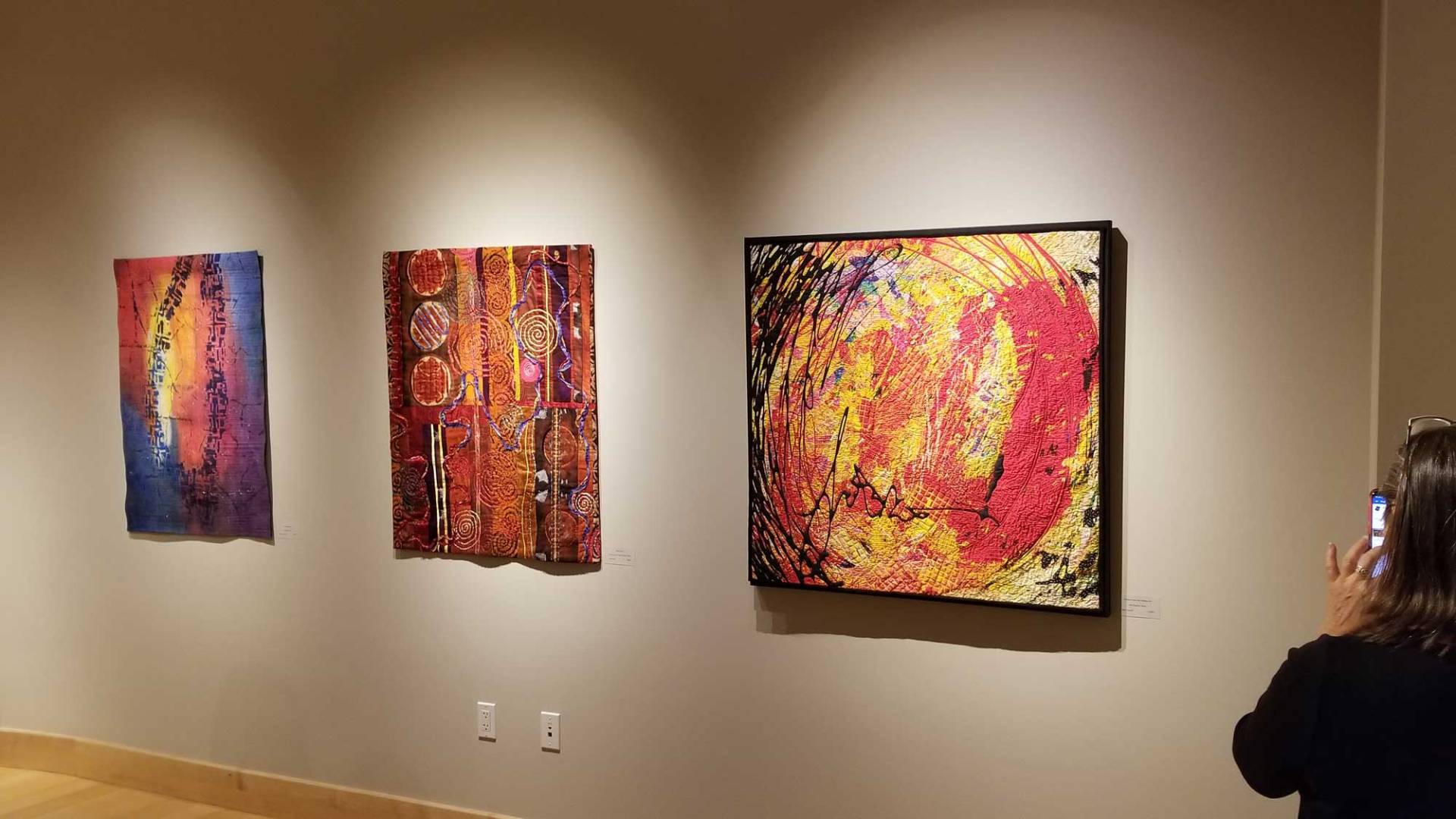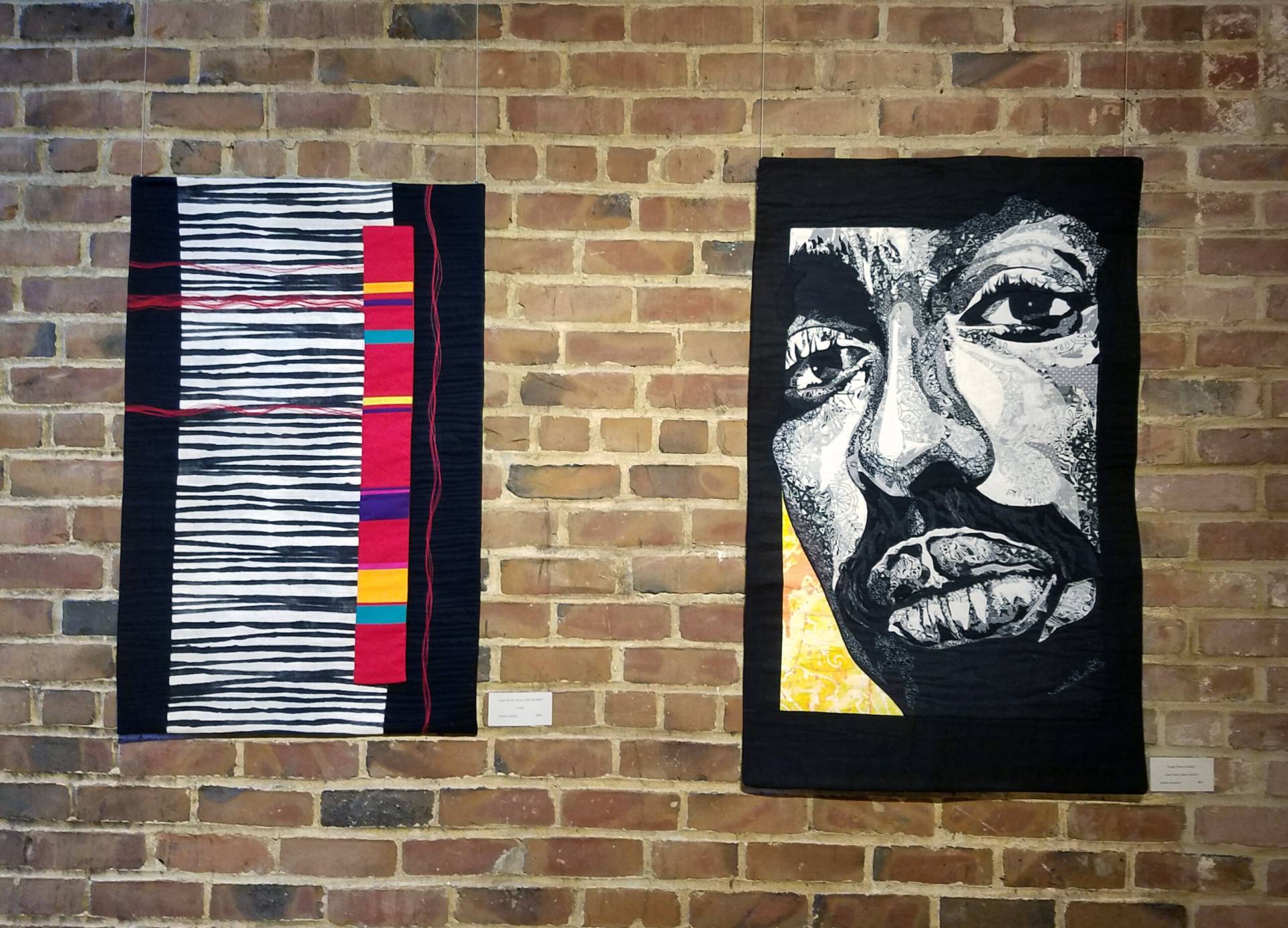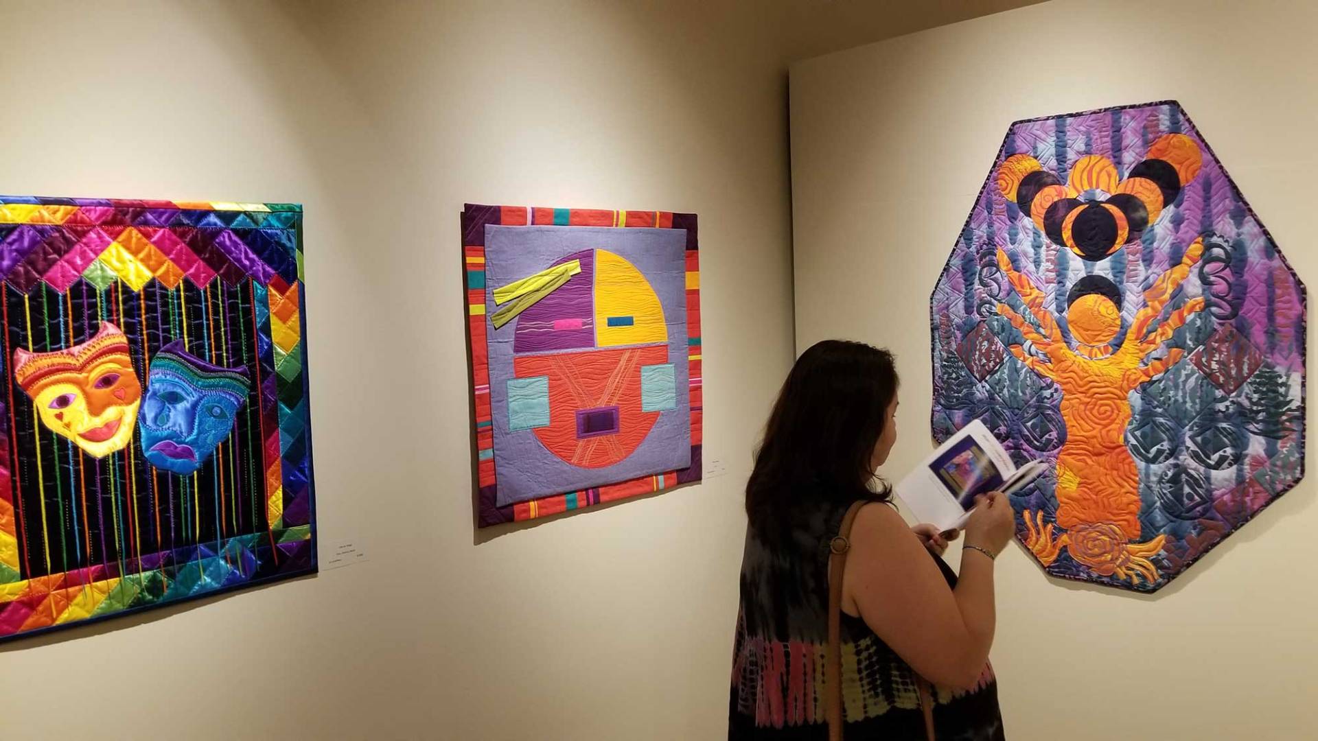 The magic and experience of a live performance leaves many impressions. Whether a comedy, a musical or a drama, it moves us all in different ways. These visions can bring a smile to our face, a song to our lips or serious thoughts and curiosities. It suggests the feelings, the colors, the movement, the rhythm, the harmony of music or a dramatic presentation. A challenge for the artists in this exhibition was to create a visual interpretation of an aural experience be it music or a theatrical performance. Artists were given the choice to use the same source of inspiration and interpret it in a wall art piece, a 3-D piece and/or a mask. Our hope was to encourage entries for this exhibition from members who had not exhibited in a SAQA show before, as well as, those more experienced artists. We wanted all artists to expand on this theme in ways we couldn’t yet envision. This exhibition provided the opportunity to have fun, be spontaneous, playful and experiment. While keeping in mind the prompt of Fibre Theatricks, artists focused on themes of music and theatre.