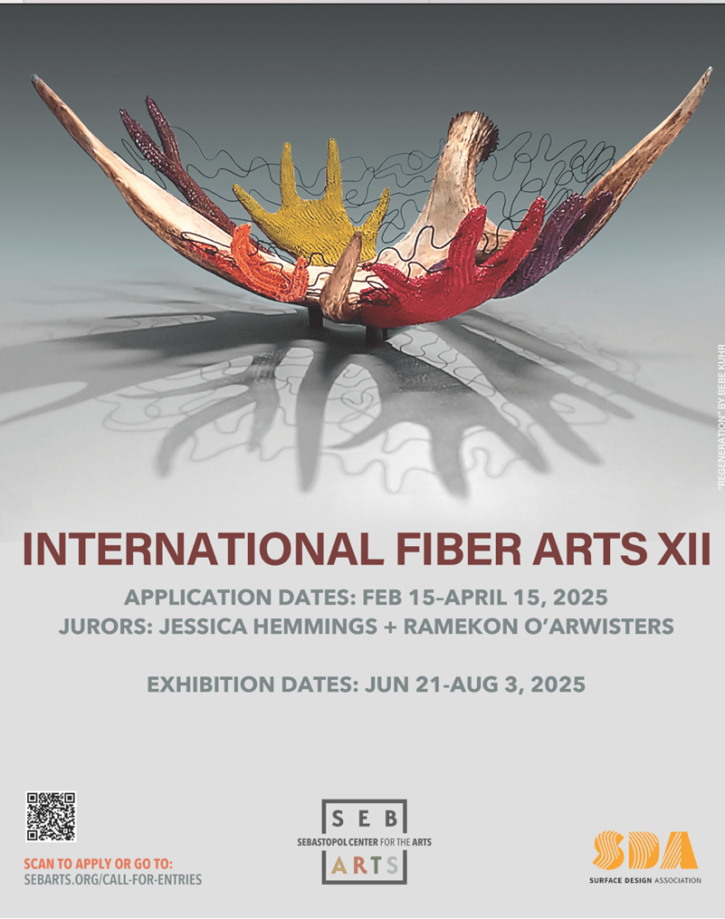 at the Sebastopol Center for the Arts in Sebastopol, CA on July 19, 2025. It will be a great opportunity to gather and see fabulous works of art (some may even be from SAQA members). A real